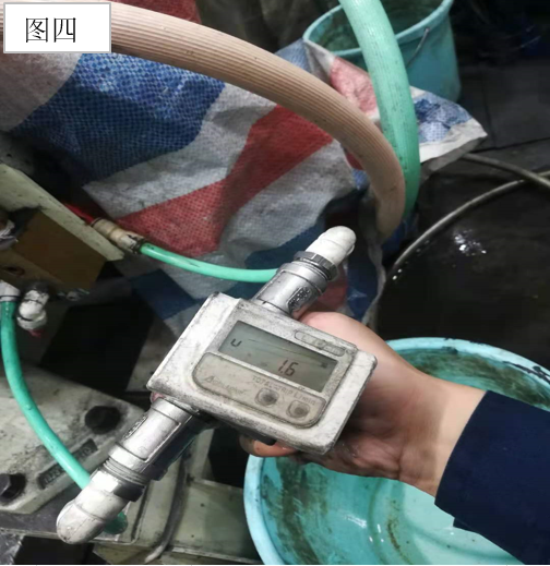 機(jī)器人清洗前流量測定:拆下機(jī)器人流量計(jì)出水端的出水管,流量測量儀的進(jìn)水端連接流量計(jì)的出水端,流量測量儀的出水端連接機(jī)器人流量計(jì)的出水管,如圖四。